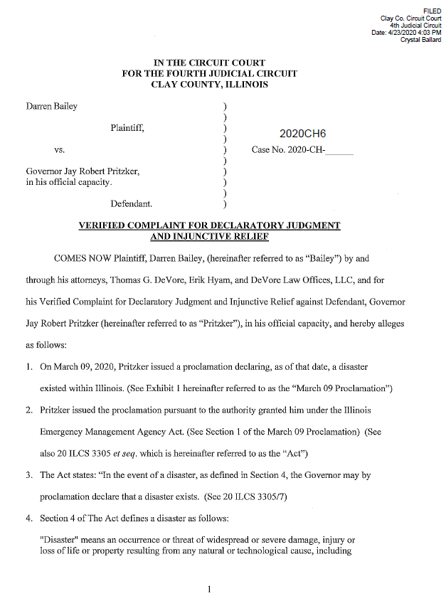 데런 베일리 일리노이 주하원의원(공화, 제니아 시)은 “JB 프리츠커 일리노이 주지사의 행정명령 연장은 권력남용”이고 자신의 권리를 침해한다며 주지사를 상대로 지난 주에 소송을 제기했다.