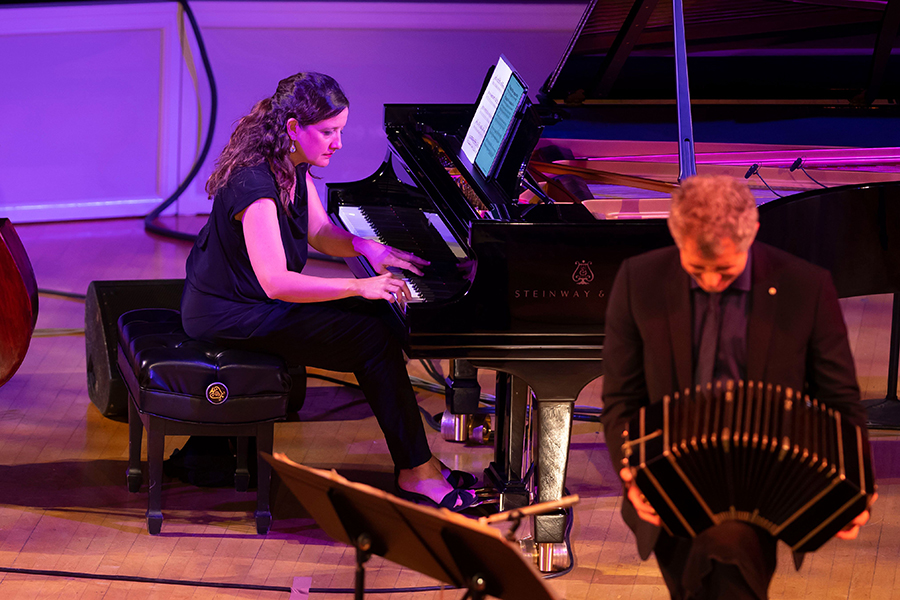 반도네온을 잡은 파블로 마이네티의 리드로 피아니스트 바바라 배라시 페가, 바이올리니스트 세르다 겔디머라드도브, 베이시스트 다니엘 팔라스카가 심포니센터의 알모 스테이지에서 피아졸라의 음악 십여 곡을 연주했다.
