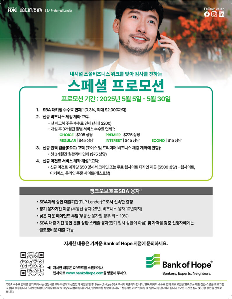 SBA 융자 고객을 위한 혜택부터 시작된다. 뱅크오브호프의 SBA 팀은 미국 전체 렌더 중 상위 2%에 속하는 성과를 자랑하며 프로모션 기간 동안 SBA 융자를 신청하는 고객에게 최대 $2,000의 패키징 비용을 면제한다. 트럼프 정부 이후 변화된 SBA 정책으로 인해 보증 수수료 부담이 늘어난 상황에서 뱅크오브호프는 고객들의 금융 부담을 덜어주기 위해 이번 혜택을 마련했다.