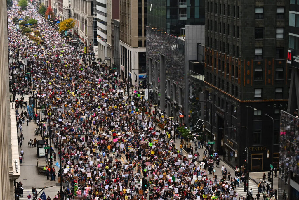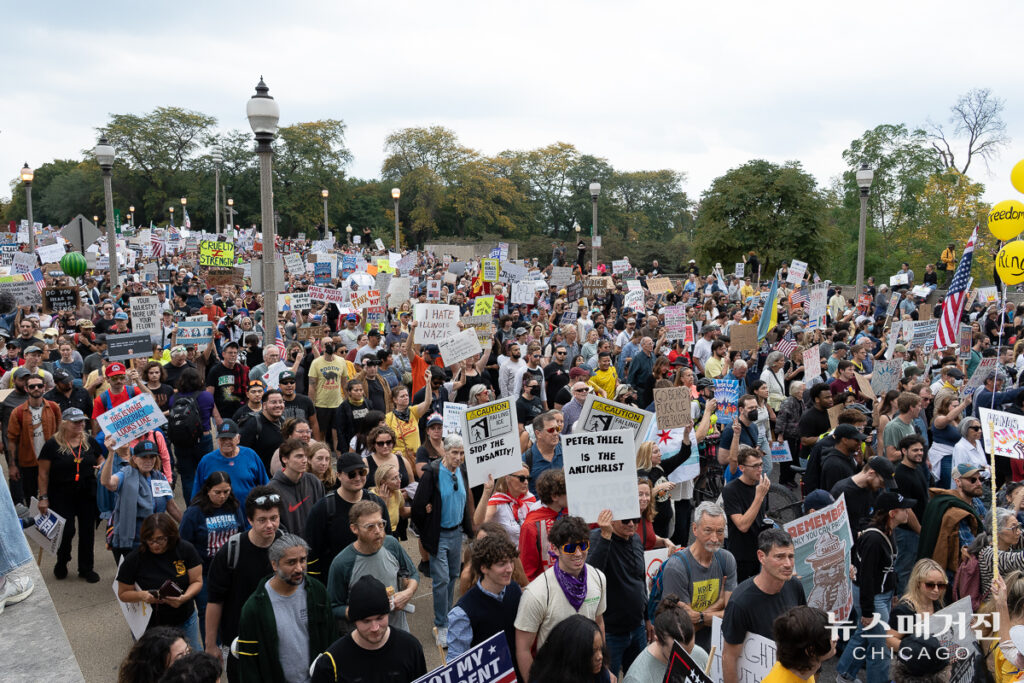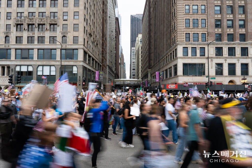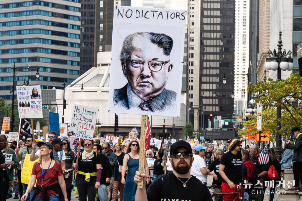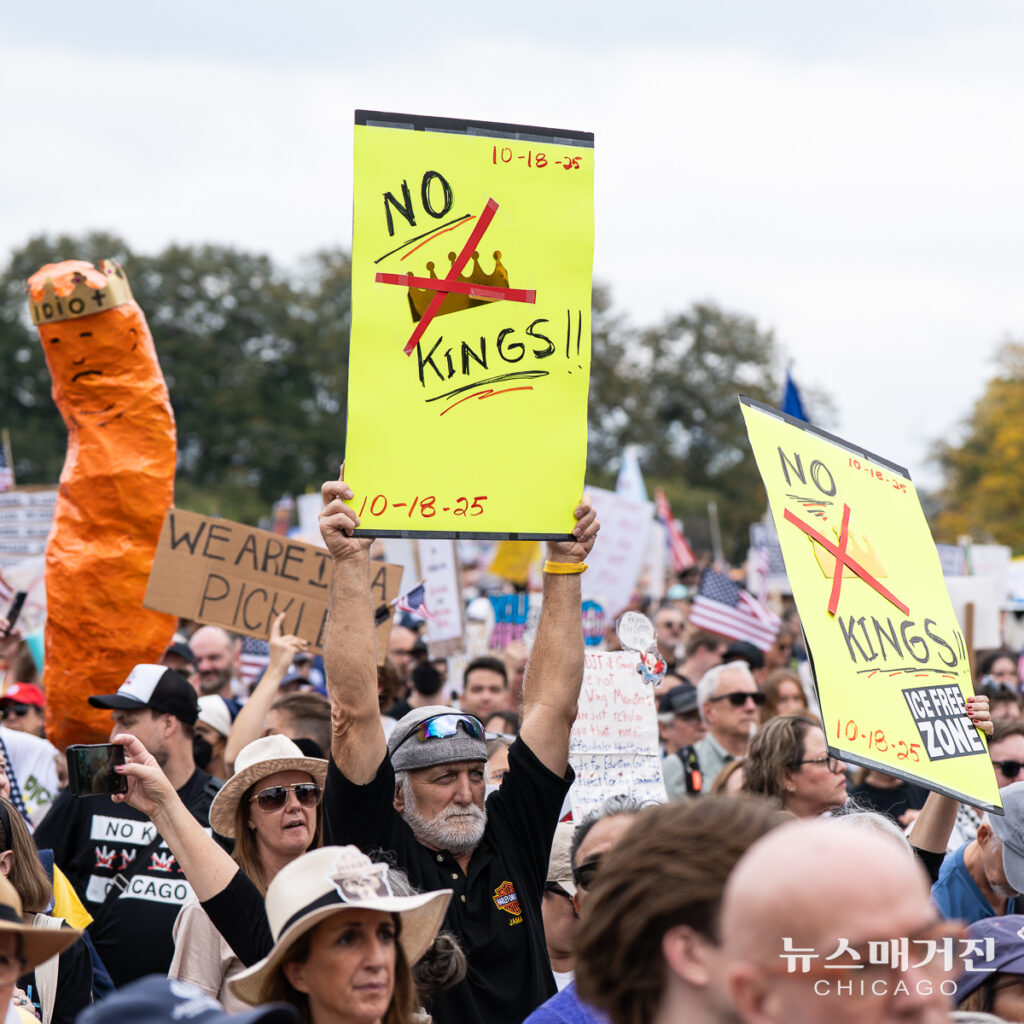 미 전역과 해외, 총 2,600 곳에서 동시에 열린 ‘왕은 없다’ 시위에 7백만 명 이상의 인파가 참가한 가운데 시카고에서 열린 집회에는 추최 측 추산 25만 명이 모였다.