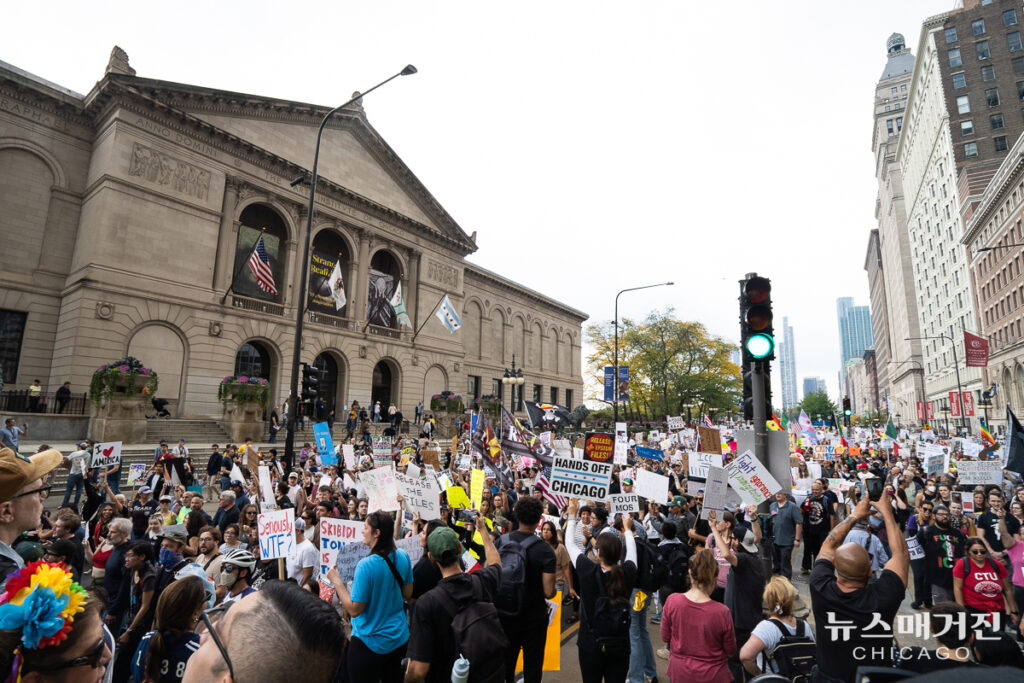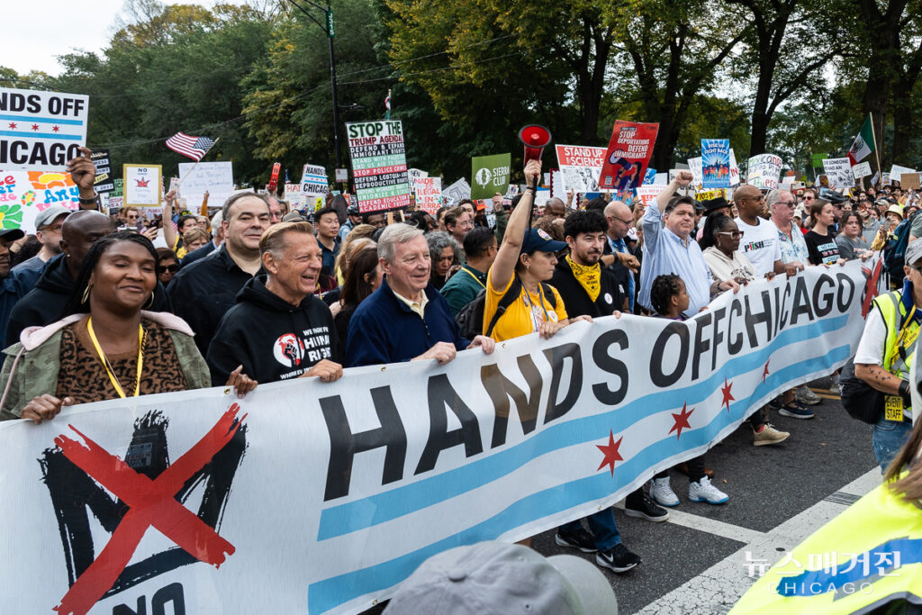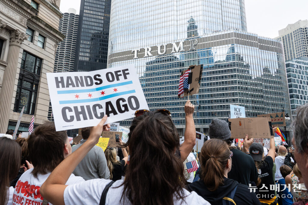 ‘Hand Off Chicago(시카고에서 손 떼라)’ 제하의 시카고 시위는 트럼프 행정부의 주방위군 파병을 거부하고 이민단속국(ICE)의 철수를 요구하는 메시지를 전면에 내세웠다.