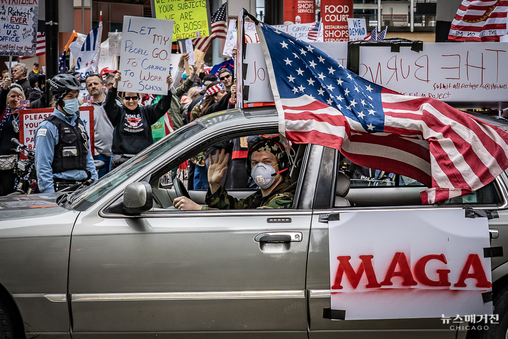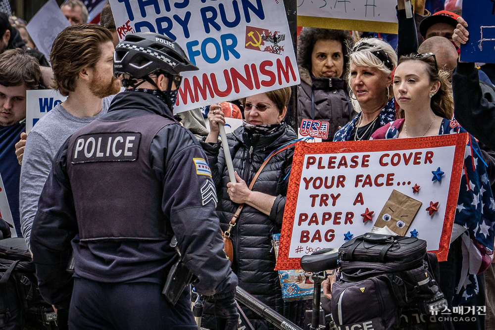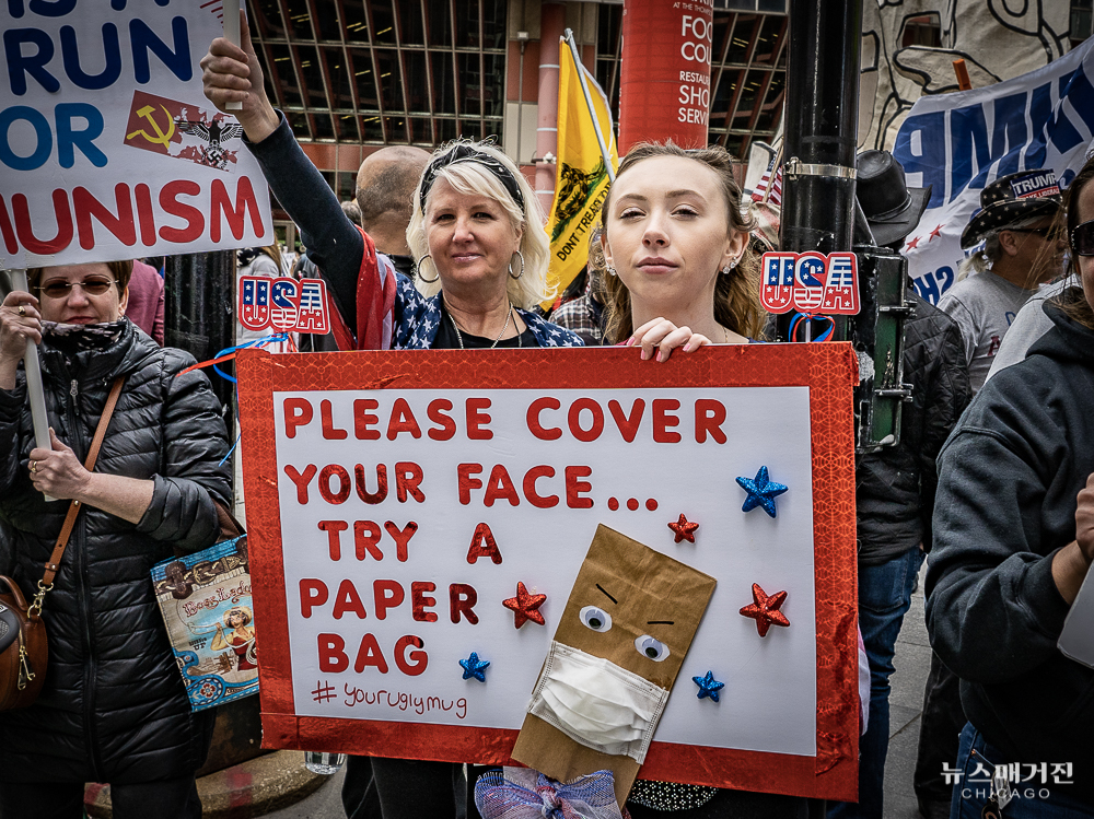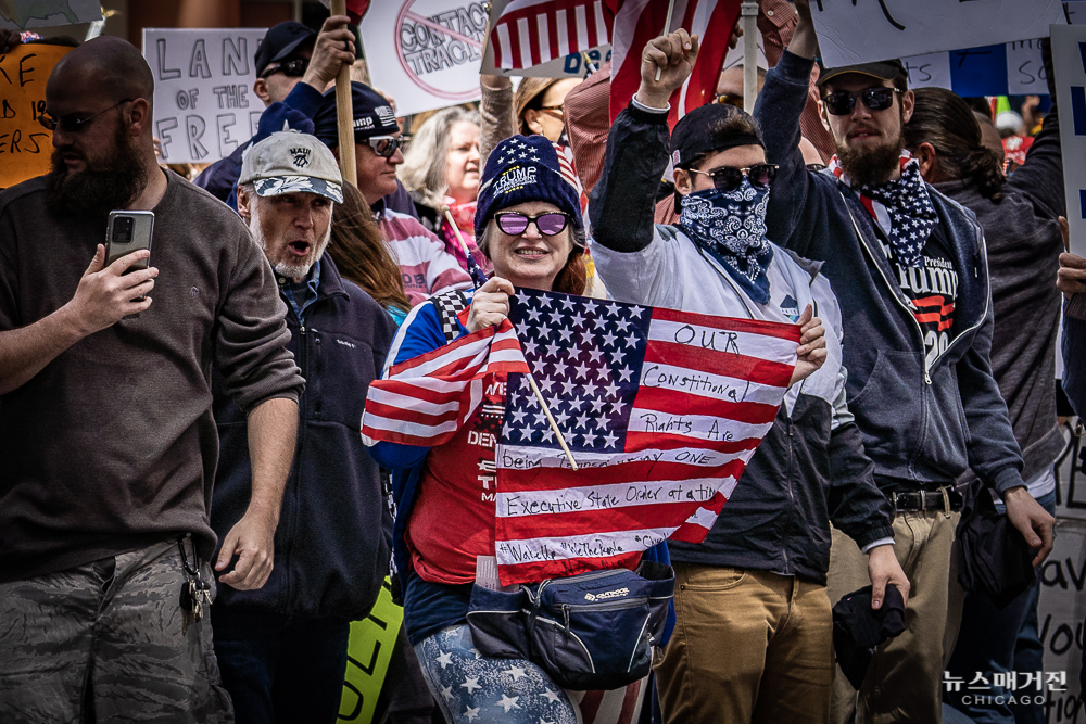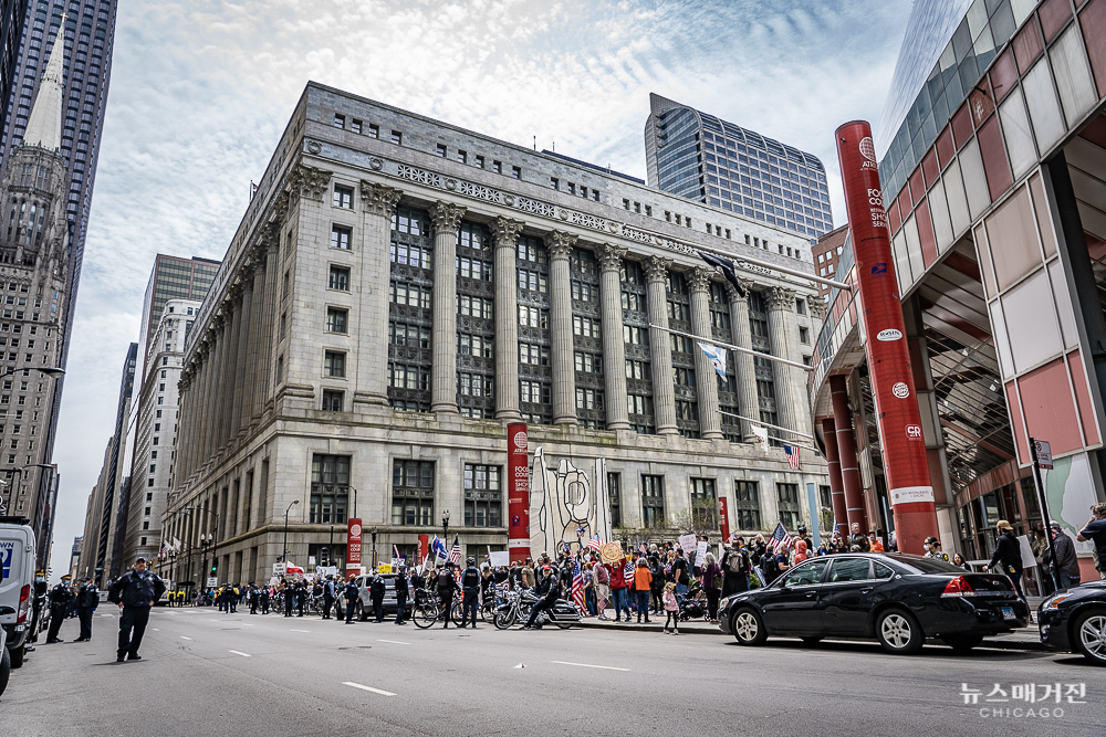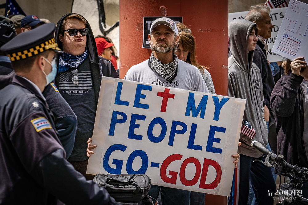 노동절이자 일리노이의 자택격리령이 30일 연장되는 오늘(1일) 시카고 다운타운 탐슨 일리노이 주청사 앞에서 일리노이 주지사의 자택격리령을 반대하는 시위가 열렸다.