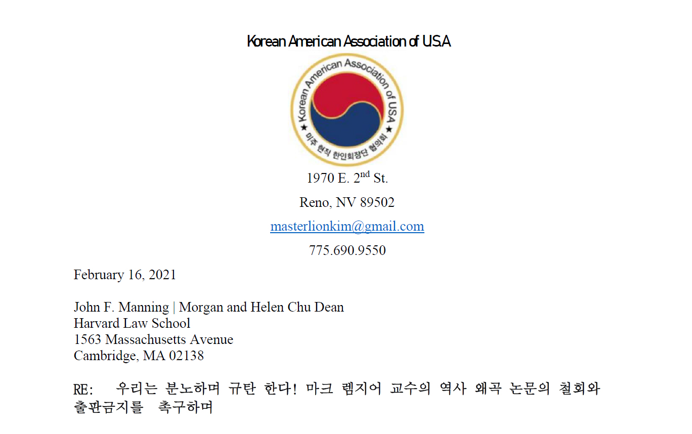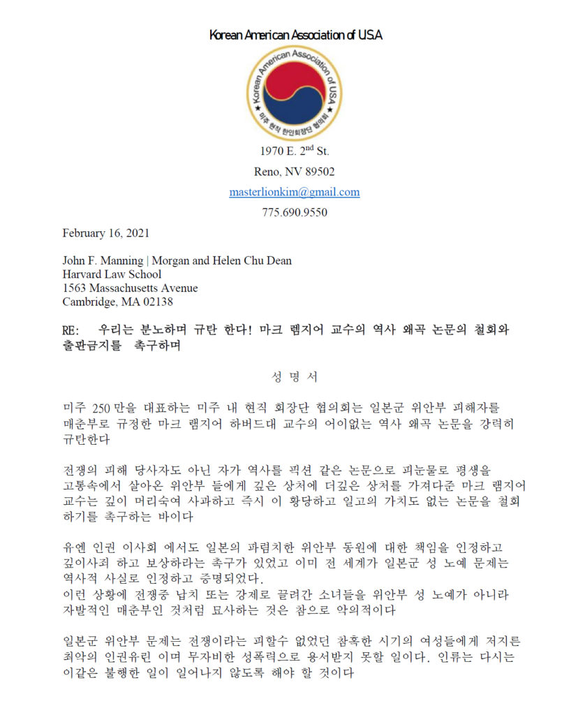 시카고한인회는 18일 하버드대학교 마크 렘지어 교수의 역사 왜국 논문 철회 및 최종 출판 금지를 위한 미주 현직 회장단 협의회 규탄 공동성명에 동참한다고 밝혔다.