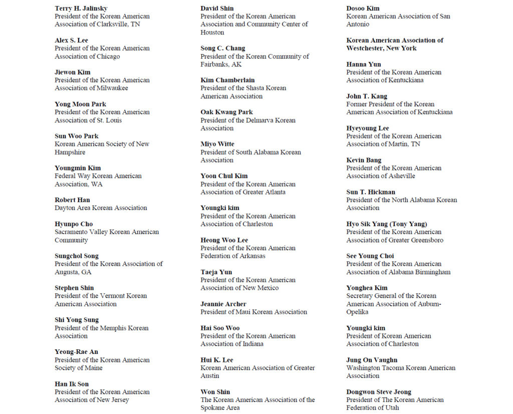 아래는 규탄 성명서와 동참 한인회장의 이름