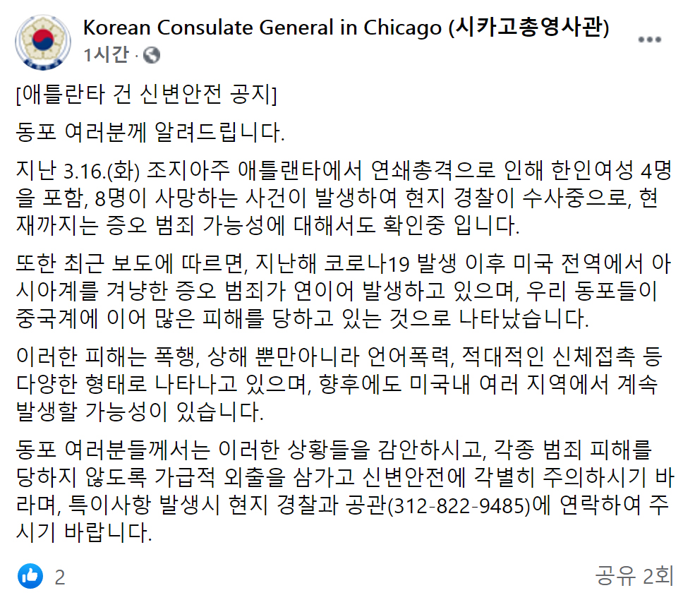 시카고총영사관은 공관 웹사이트과 페이스북을 통해 아시안 혐오 범죄 현황을 조명하며 피해를 당하지 않도록 가급적 외출을 삼가고 신변안전에 각별히 주의할 것을 당부했다. 특이사항 발생 시 현지 경찰과 공관(312-822-9485)에 연락하라고 전했다.