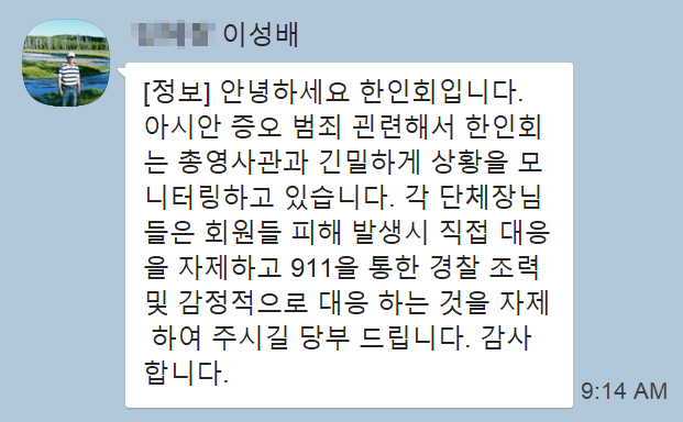 시카고한인회는 오늘 긴급 전화문자를 통해 피해 발생 시 직접 대응을 자제하고, 911을 통한 경찰 조력을 받을 것을 당부했다.