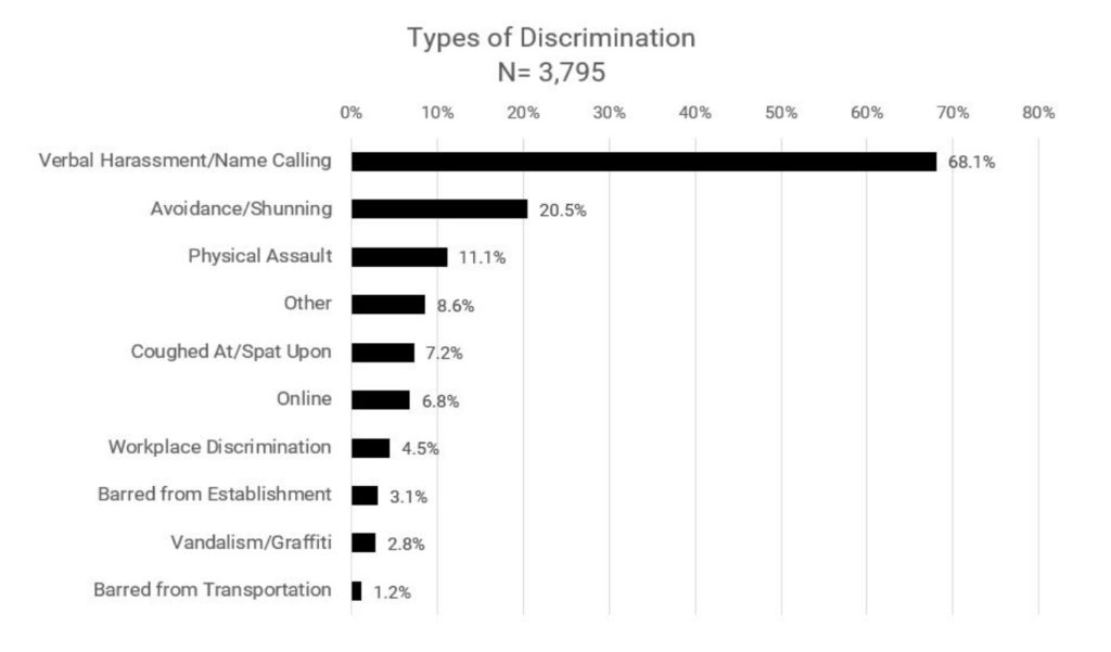 혐오 행위 통계는 언어폭력(68.1%), 기피행위(20.5%), 폭행(11.1%), 기침 또는 가래뱉기(7.2%) 순이었다.
