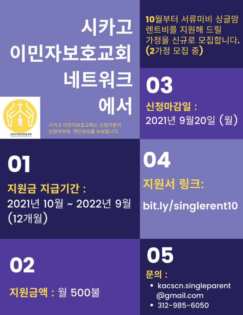 싱글맘 렌트비 지원에 대한 문의처는 이메일 kacscn.singleparent@gmail.com 과 전화 312-985-6050 이다.