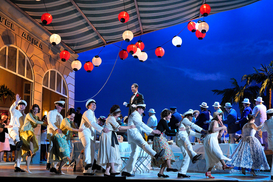 시카코 리릭오페라 데뷔를 장식한 연출가 다니엘 슬레이터는 19세기 배경의 원작을 20세기 중반으로 시대를 옮겨 풀어내며 관객과의 효과적인 교감을 유도했다. 다만 총 2막이 오로지 아디나 호텔 배경에서만 전개돼 비용을 절감한 무대세트라는 인상을 풍겼다.