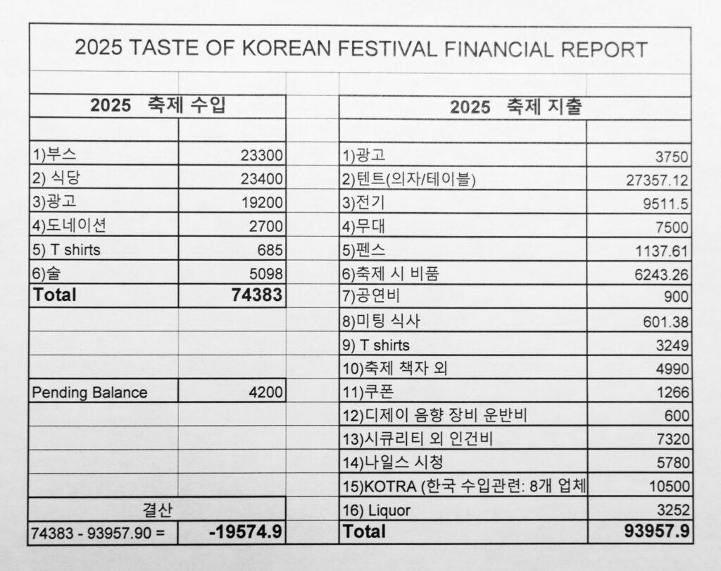 보고에 따르면 올해 수입은 ▲부스비 2만3천300달러 ▲식당 참가비 2만3천400달러 ▲광고 수익 1만9천200달러 등 총 7만4천383달러였다. 반면 지출은 ▲텐트 설치·설비 2만7천357달러 ▲전기비 9천511달러 ▲무대 설치 7천500달러 ▲보안 및 인건비 7천320달러 등 총 9만3천957달러로 집계됐다. 미수금 4천200달러를 제외할 경우 최종 적자는 1만9천574달러다. (결산표 기사 하단 게재)