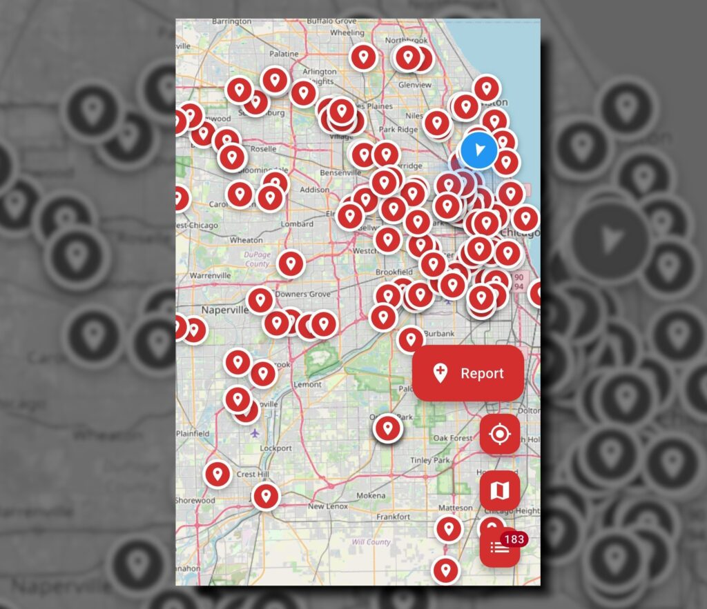 아래 사진은 시민 제보를 기반으로 ICE의 동시다발적 단속 및 이동 상황을 보여주는 스마트폰 앱 ‘레드 닷(Red Dot)’의 10월 초 캡처 화면이다. 시카고와 서버브 전역에서 이민 단속이 얼마나 광범위하게 동시에 이루어지고 있는지 확인할 수 있다.